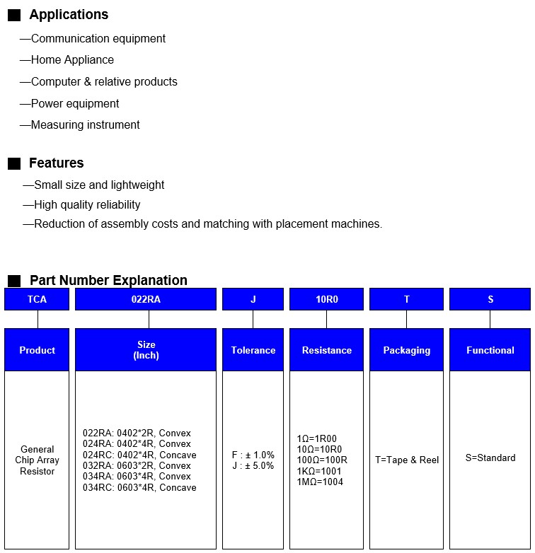 General Chip Array Resistor型號:TCA Series描述:Size 0402*2R / 0402*4R / 0603*2R / 0603*4R 下載產品規格書 下載產品規格書
