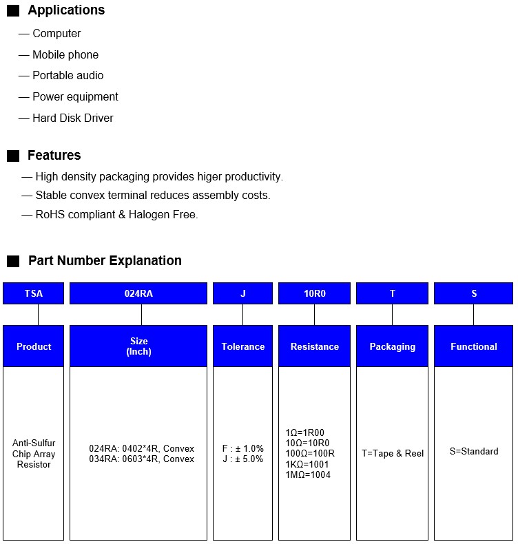 Anti-Sulfur Chip Array ResistorPart No.:TSA SeriesDescription:Size 0402*4R / 0603*4R Download Download
