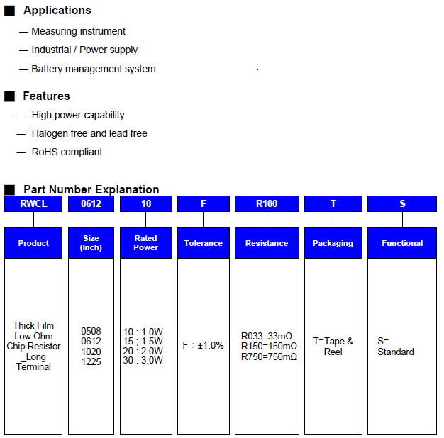 Thick Film Low Ohm Chip Resistor_Long TerminalPart No.:RWCLDescription:Size 0508, 0612, 1020, 1225 Download Download