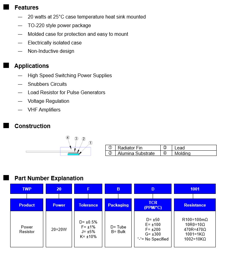 Power ResistorPart No.:TWP20, TWP30, TWP35, TWP50, TWP100Description:TO220 20W, 30W, 35W, 50W, TO247 100W Download Download