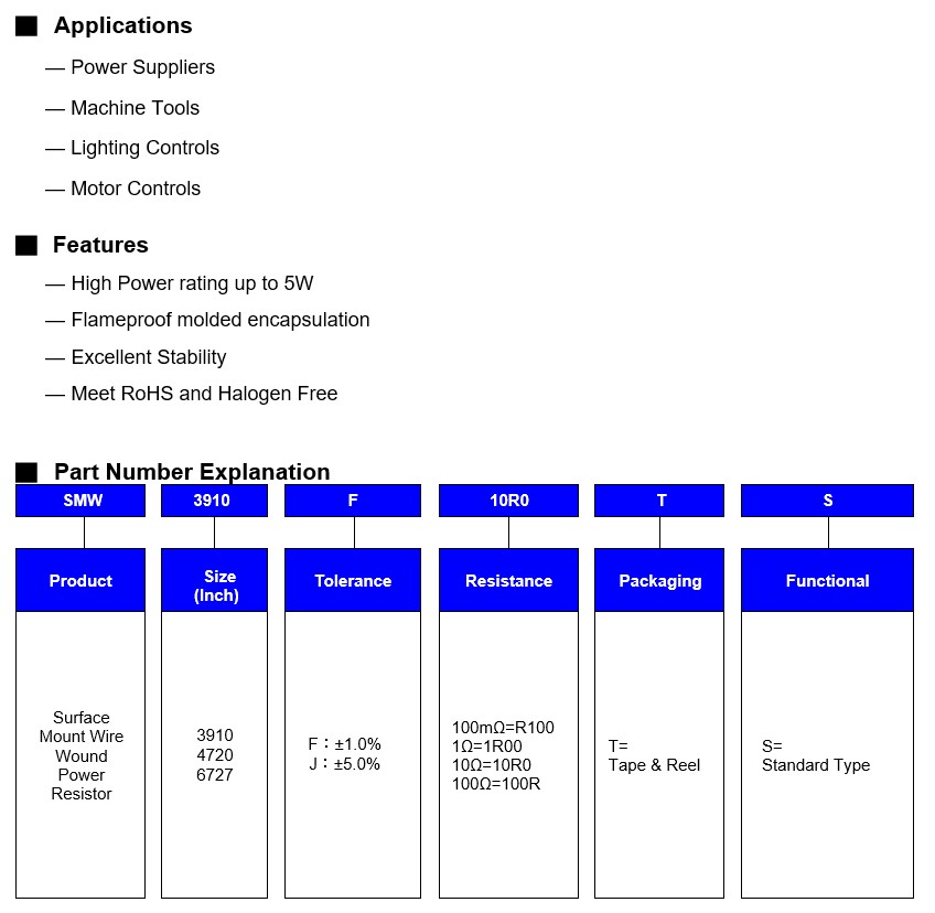Surface Mount Wire Wound Power ResistorPart No.:SMWDescription:Size 3910 / 4720 / 6727 Download Download